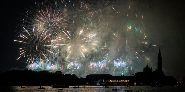 Infine, la navigazione verso il Bacino di San Marco, dove il cielo si è acceso con il celebre spettacolo pirotecnico che da oltre cinque secoli celebra la liberazione della città dalla pestilenza del 1575–1577.